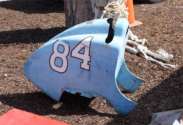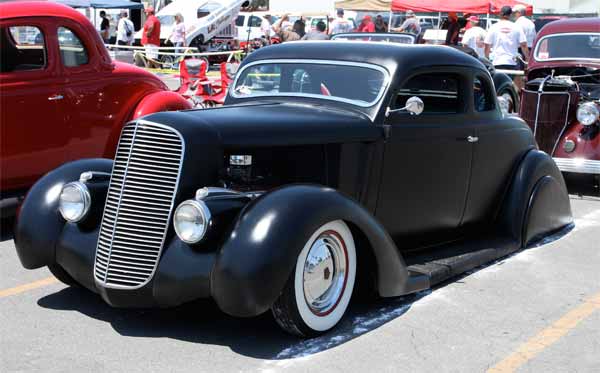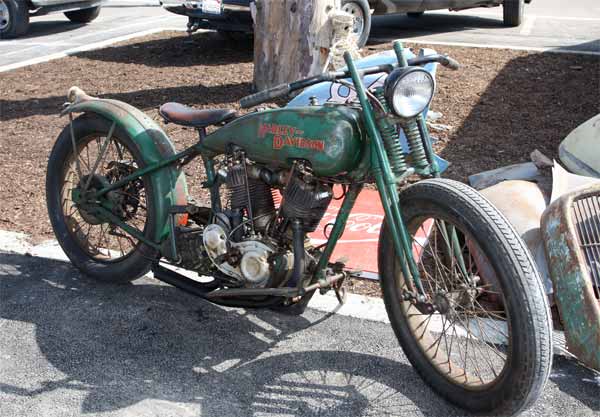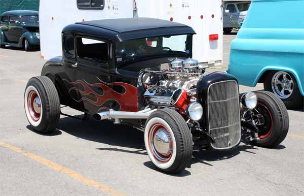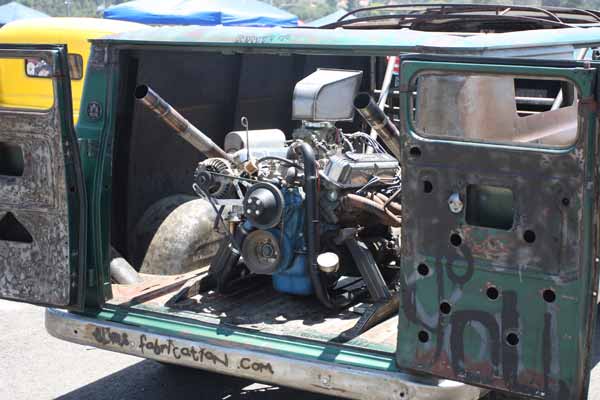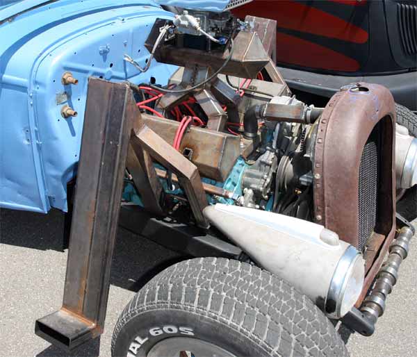 Study this shot closely: a rat rodder with a whimsical streak. Note the square radiator hose and really look closely at the carberator manifold. Also the cam used as a spreader bar on the frame.