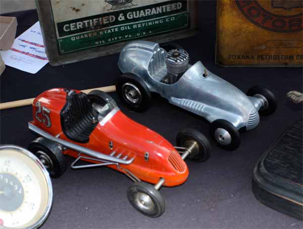 | I LOVE tether cars and still have mine, a Thimble Drone, mounted on the wall right in front of my computer. Note the cleverly hidden engine in the front one with the glow plug sticking up through the seat. These things aren't cheap any more. Asking price on the front one, an O & R, was $800! |