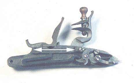 On a straight barrel, the wrist can be too skinny, so it helps to solder a little wedge-shaped piece of metal on the back of the lock bar under the flash pan that kicks the back of the lock plate out a little. The piece doesnt have to be very thick. If its 1/32 (.035) at the back and tapers to nothing at the front, thats fine.